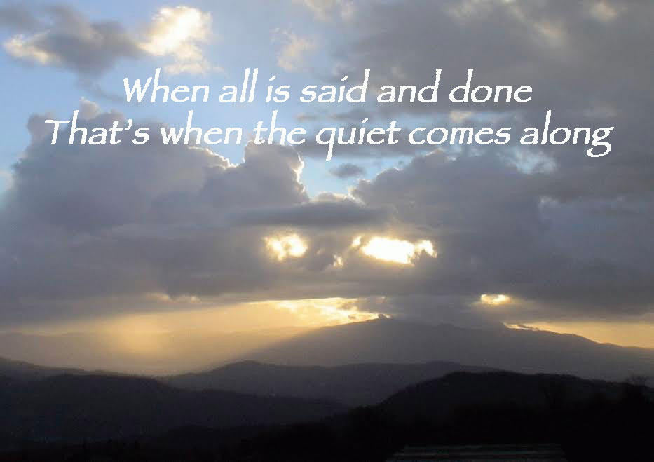 We wrote the following song as a lullaby, to shift ourselves into a more serene space, even if only temporarily. We feel the need to close each day and year with something soothing, something to calm frazzled nerves and agitated thoughts. The swaying rhythm and the reassuring words give us hope and the strength to face each tomorrow. When those new moments arrive, we will hopefully be refreshed and open with anticipation, yet braced, for whatever arrives. Yet, we are fully aware that at the end of every day, or extended period of challenge, once again, serenity will prevail. Quiet will surely Come Along.