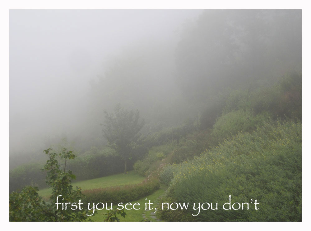 Without wasting a moment, I briskly descended the steps and then slipped out the door. I gently stepped through the wet grass like a cat on an early morning prowl, to enter the garden. When I reached the old stone bench, I sat down precisely in the center. Back straight, head up, eyes closed and releasing all thought, I took several deep breaths. I could feel it sweeping up the hillside toward me—cool fresh fog, thick, misty and full of intention. I could hear it approaching through the treetops, pushing the air aside. I imagined the taste of cold steely freshness as it surrounded me, shrouding everything in its path.