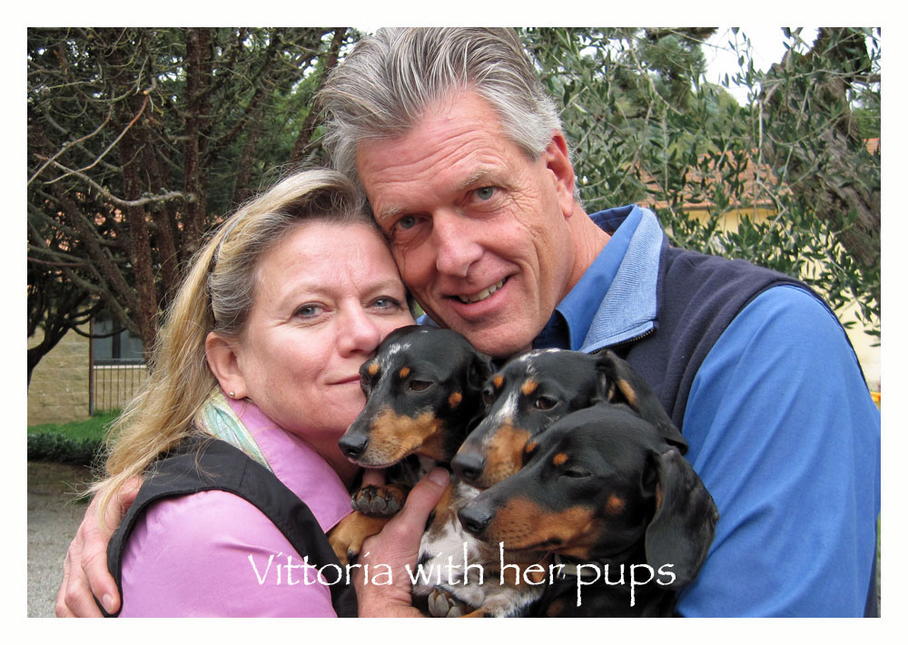 As they drove away, we waved goodbye to the band of birthday celebrants. The girls were already snuggled into their pillow on the backseat, curled into perfect circles as only dachshunds can form. We closed the gate and slowly climbed the stone steps back up to the house to survey the spoils of the party. We loaded the dishwasher and picked up all of the orange and white pieces of the squeak-toys which had been bitten from the edges by the little enthusiastic bassotti. Then we sat down in the cool of the early evening, recounting the many pleasant and laughable moments of the afternoon. Mostly, we talked about our own little dachshunds in California awaiting our return. We smiled at the boundless energy of our two tiny guests. For us, it’s really impossible to see a little puppy, pick it up, hold it close, and not love the stars out of it! Or, maybe it’s just puppy love.