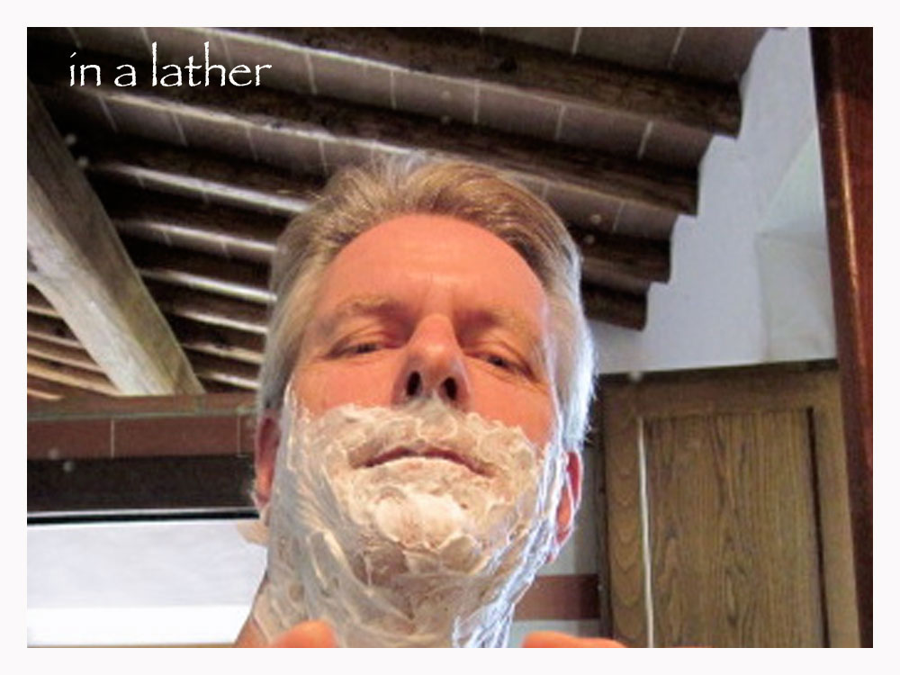 Here’s what happened Friday morning at 7:45 am. I was standing in the bathroom, gazing into the mirror. Then routinely, I began to apply my schiuma da barba, shaving cream as I do every morning. At 7:48, my face was covered with about 1/2″ of white foam on all of the appropriate areas, nicely done, and ready for the blade. (I do usually admire my even-handed application of the foam. But typically I don’t take a picture. C’mon, that would be ridiculous! It’s a re-enactment for the story.)