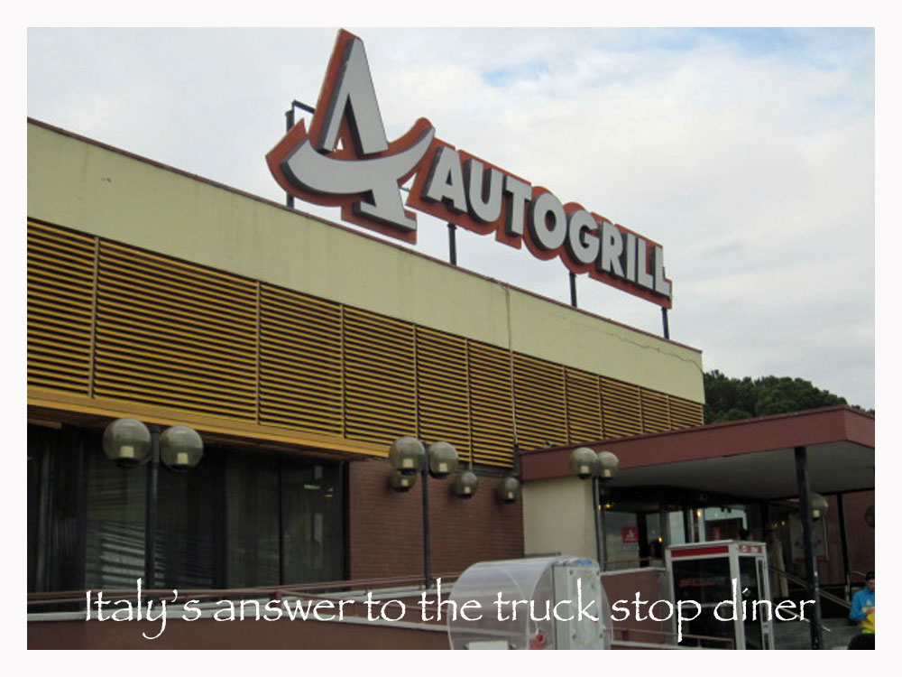 The autostrada is well maintained and a great way to see the country. It’s a fascinating system of well-designed roads, bridges and tunnels (the Italians are masters at burrowing through the mountains and spanning valleys). But, in addition, they have another feature that makes them even more interesting—the Autogrill. Anyone who’s ever made road trips in Italy can attest to the fact that these roadside restaurants/service stations are unusual and interesting places, to say the least. At regular intervals, the familiar and friendly pit stops offer just about anything you might need to freshen up a bit or make your trip safer and more memorable. Maybe, in their strangely diverse gift shops, you could even buy a surprise for the friends that you’re going to visit. On the simple side of things, the caffè is always the perfect “pick-me-up.” But, they’ll also have a variety of pizzas by the slice, right out of the oven, and will warm up any of the yummy panini, sandwiches that your little heart desires.