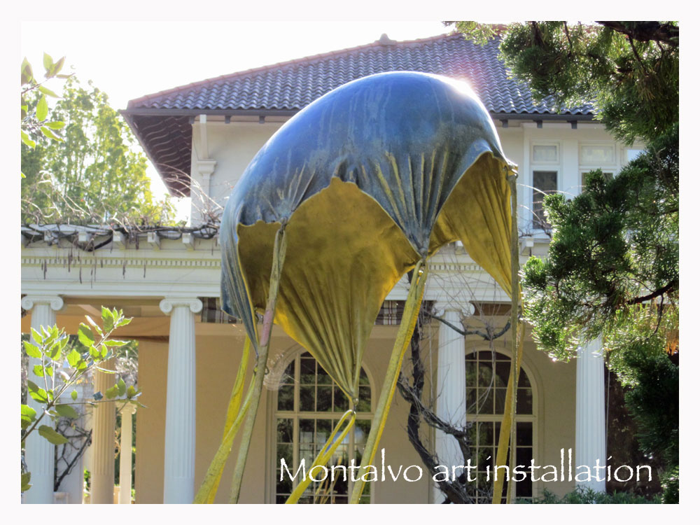 One of our favorite morning walks in California takes us through the gardens of the beautiful Villa Montalvo Center for the Arts. You never know what you might find around each wooded turn because they’re constantly changing the outdoor sculptures, providing that element of surprise. One day we found an artist constructing a fairly large house out of sticks. Another time we came upon a new fortress in the front yard made entirely from stacks of paper (even more interesting after it rained). Then there were the strange heavy, unexplained floating objects. And let’s not forget the creepy giant cocoons the size of a small car, we found laying by the path up the hill. But today, our sculpture hunt was a little more challenging—like up in a tree!