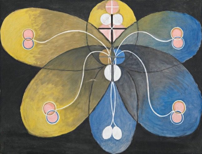 A member of the Association of Swedish Women Artists, af Klint enjoyed camaraderie with like-minds. But the art world has a long history of male dominance, which caused Hilma to struggle to secure exhibition space. In fact, records show that she may have displayed some of her striking abstract works only once during her lifetime. Despite the challenges, she persisted, creating major stylistic advances ahead of her male peers, Vasily Kandinsky, Kazimer Malevich and Piet Mondrian, well-known abstract expressionists at the time. They created their groundbreaking style, rejecting “reality” literally years AFTER af Klint had already quietly invented such radical new forms.