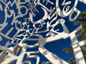 The brilliant blue sky creates stark contrast as we gaze upward. Woven together are seemingly random sweeping white ribbons and a variety of shapes. Quickly, letters come into view. These are the lines and figures that enclose us. The myriad diverse letters are gathered from many languages heard within and around the city. Words seem to float in the very air we breathe. You become, and remain an integral part of this bustling metropolis whether living here or just visiting. You can feel the ocean breeze wafting past you, like a balmy current through a screen door on a warm summer day. You are changed.
