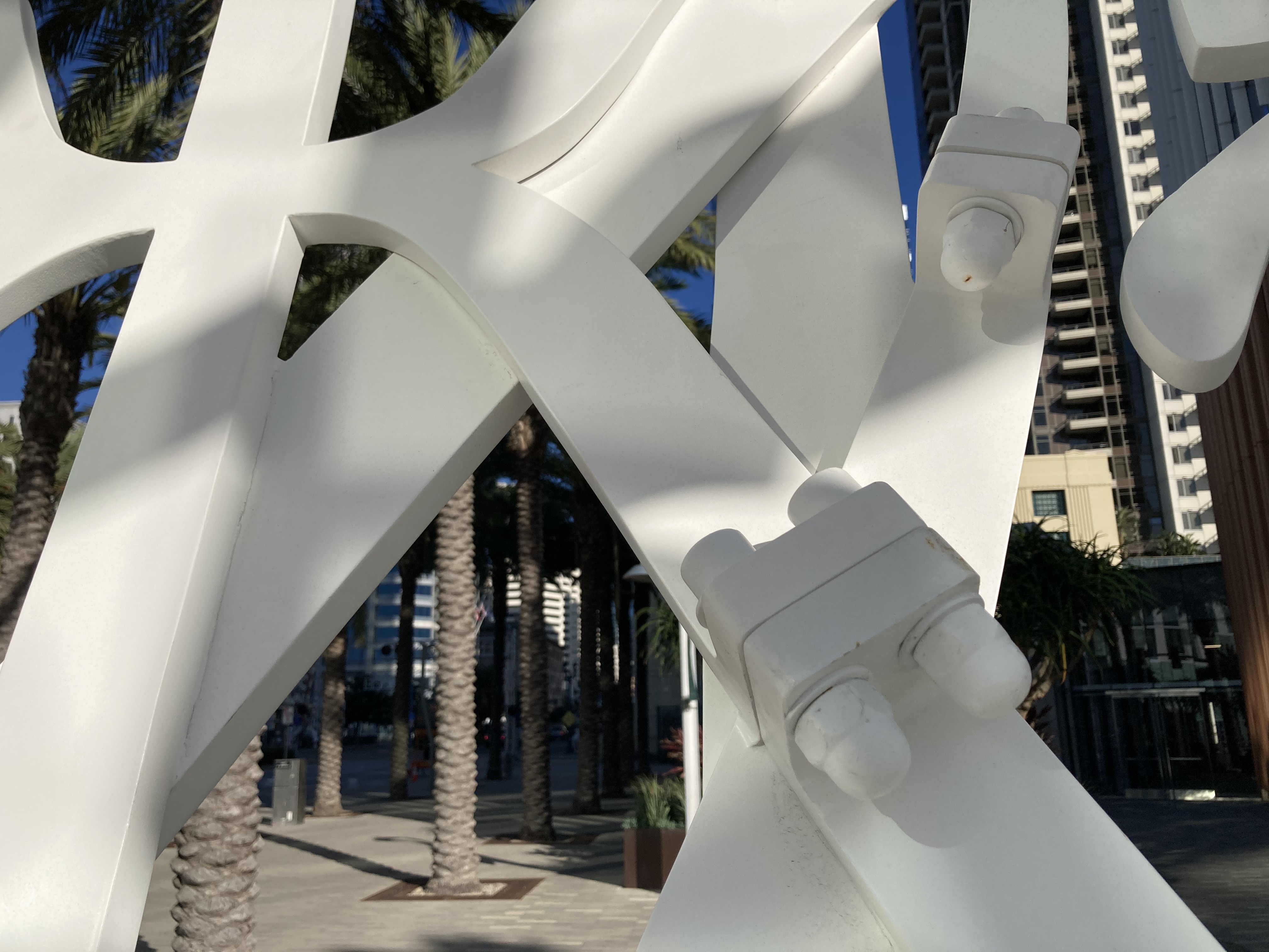 The brilliant blue sky creates stark contrast as we gaze upward. Woven together are seemingly random sweeping white ribbons and a variety of shapes. Quickly, letters come into view. These are the lines and figures that enclose us. The myriad diverse letters are gathered from many languages heard within and around the city. Words seem to float in the very air we breathe. You become, and remain an integral part of this bustling metropolis whether living here or just visiting. You can feel the ocean breeze wafting past you, like a balmy current through a screen door on a warm summer day. You are changed.