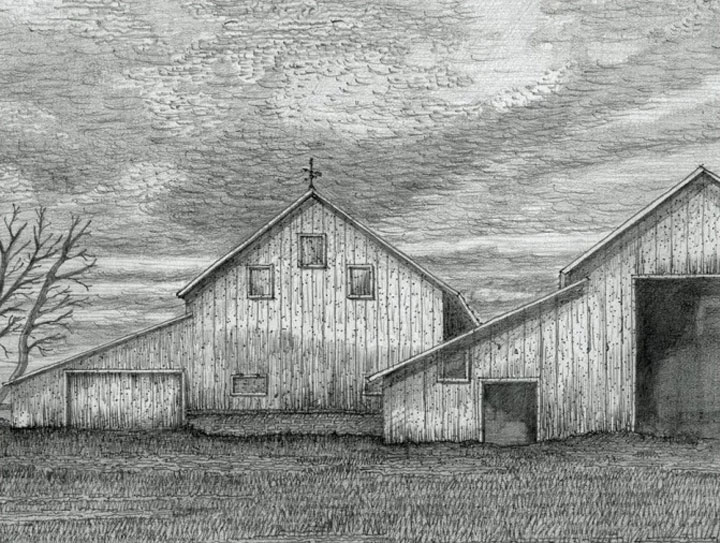 This drawing is about the heart of the matter. As midwesterners we consider ourselves children of the Heartland. This image for us says it all: beautiful and practical barns, serious farming to feed the world, flat, expansive properties, open and transparent as far as one can see, and friendliness that comes straight from the heart. These qualities are familiar and sensed by all, no matter where you come from, as part of our broader heritage.