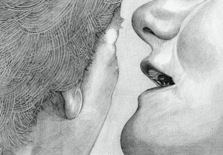 This drawing is about conversation. Love takes on many forms ranging from romantic to agape love. The one thing they all have in common is conversation whether explicit, whispered or offered in silent prayer. And of course, quality conversation and relationships take time. This drawing is perhaps the simplest and sweetest of all—whispering in the ear of someone you love. For us, that is one of the most beautiful ways to express love.