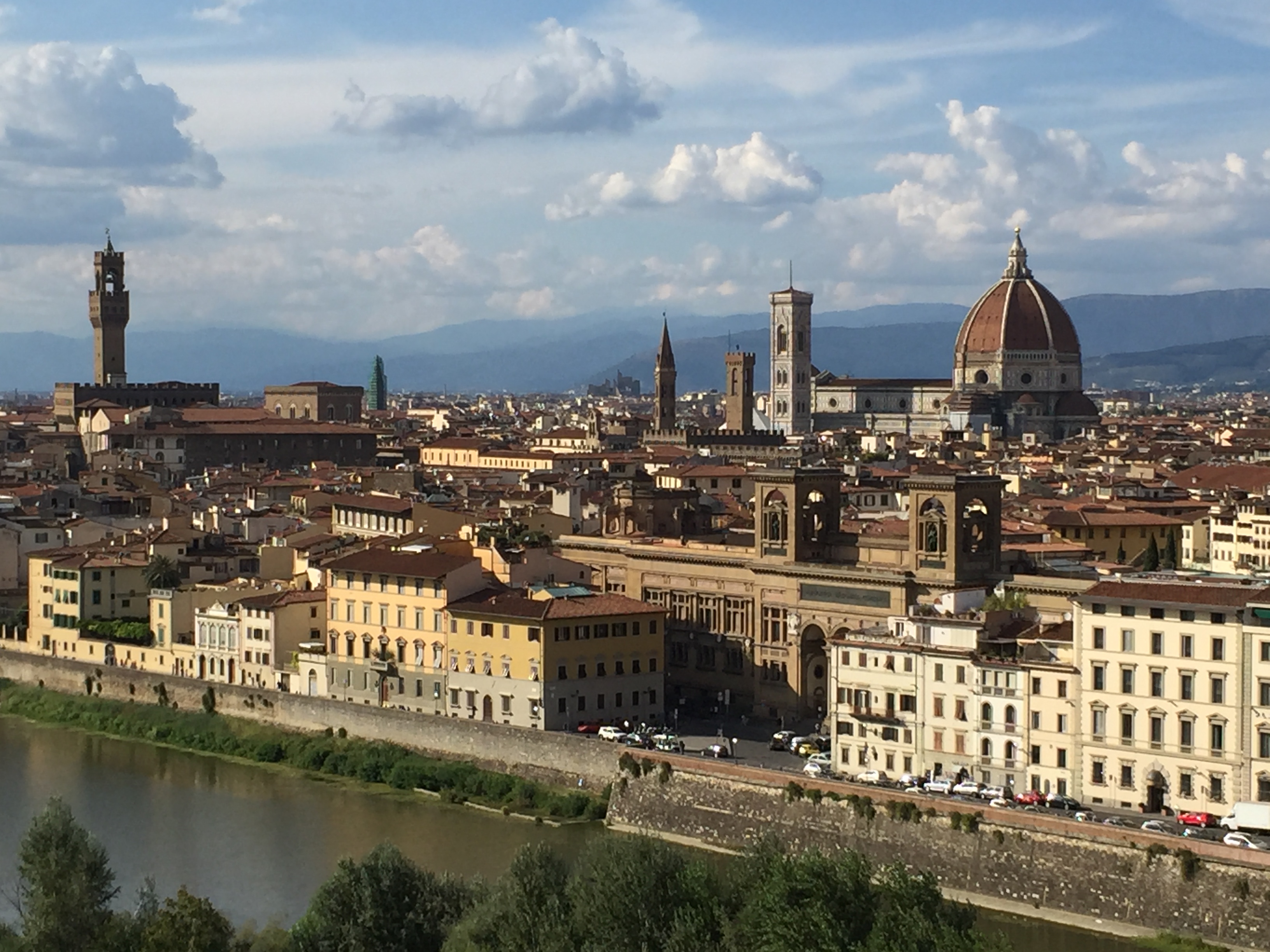 Suddenly, walking/running was our only remaining option, without a word, we instinctively started off, wasting no time. Earlier we had entertained images of casually walking through the ancient Florentine streets, basking in the sun on our special day. Those images evaporated, to be replaced with actual images of shortcuts we could remember to avoid the crowds. Hardly able to keep the telephone up to an ear, between our jarring footsteps and trying to catch our breath, we called Barbara. “We’re in Florence, in ritardo, late. We’ll be there subito, right away.” Speriamo, We hope!
