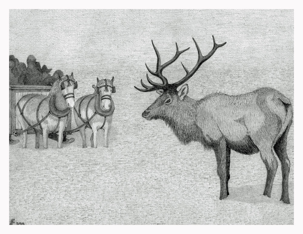 Mid-February Cheryl visited our daughter Iris in McCall Idaho, where she was living at the time. When Cheryl returned, she told the story of riding in a hay wagon into a meadow where they fed at least 100 Elk. The image was really powerful, so we decided to try and recreate the scene in music/story.