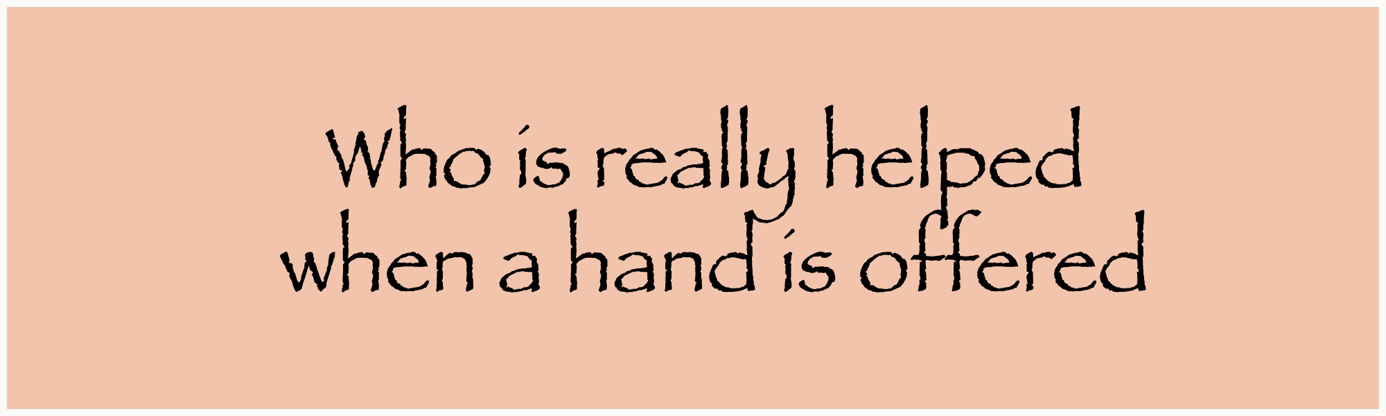 Helping-Hand-LacingSometimes we just observe. Our friends Gary and Rosemary have a particular way they are together. They constantly watch out for each other—spotting dangers worth a warning, anticipating what the other one needs, or just simply helping out. At times, it’s hard to tell who is helping whom.