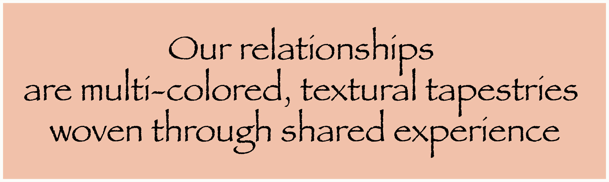 The drawing was Cheryl’s idea of using a weaving to illustrate the interwoven aspects of our lives—particularly as we began sharing in broader and broader ways. Soon, our life was becoming a rich textured fabric, just like the image.