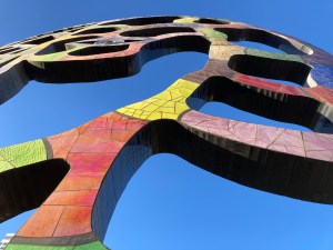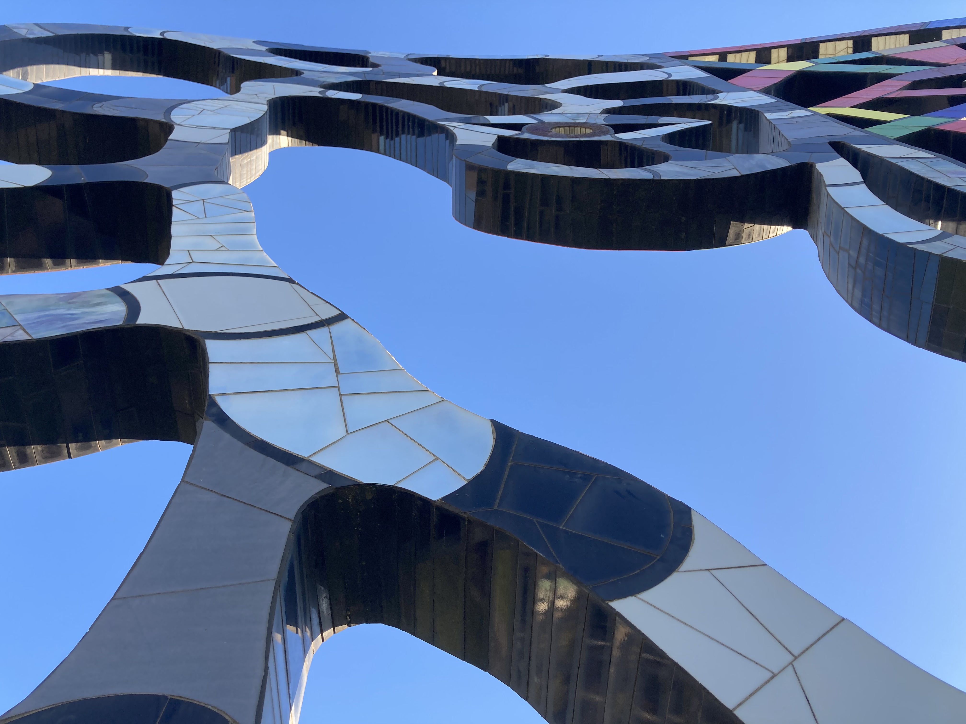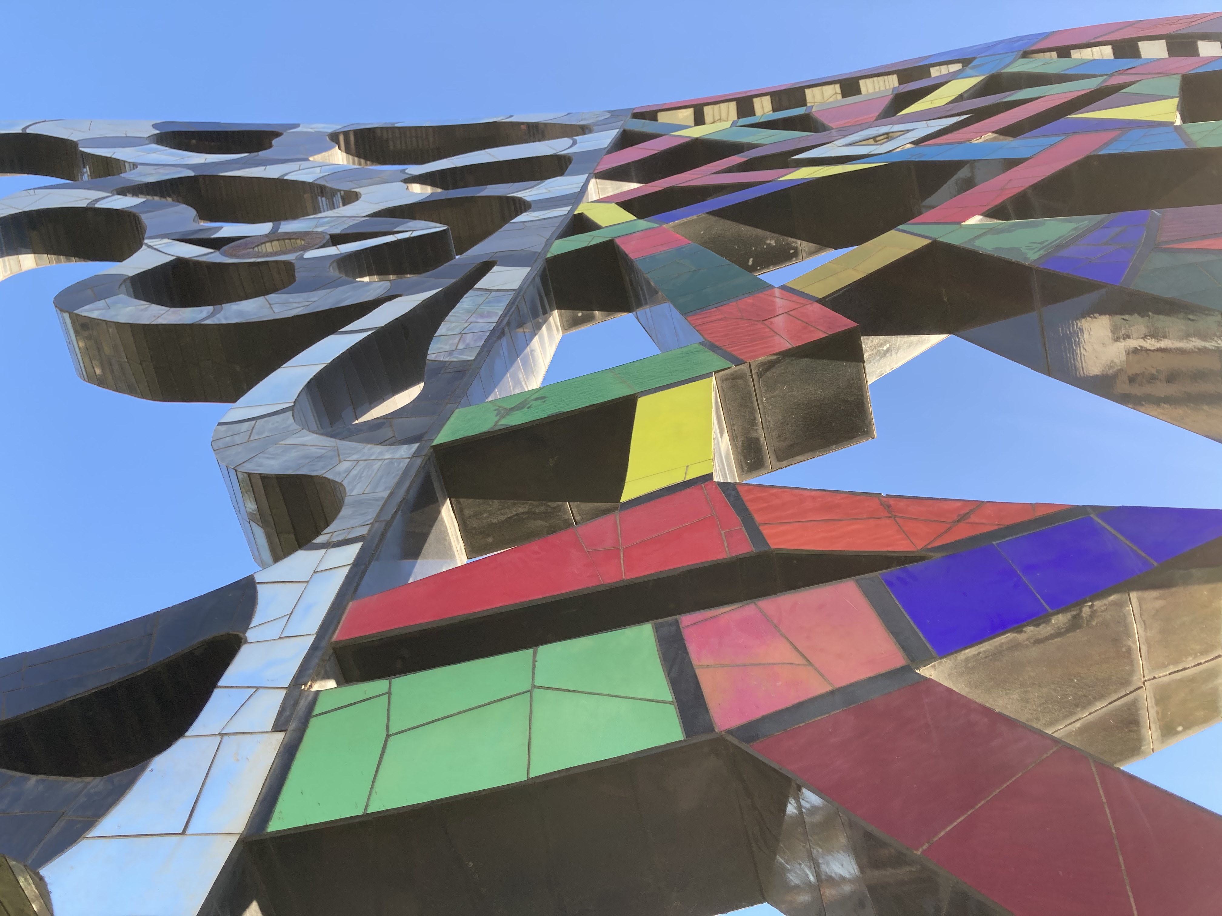 Overall, she seems to be saying that light and shadow are always at play—in both her art and within humanity. Every light casts a shadow and every shadow needs light for contrast. Is this a fundamental truth of existence? From Harbor Drive, the sculpture appears to be a rather simplistic dichotomy. Over half is colorful, curvilinear and dynamic, while the other smaller section of the face is devoid of color, hard-edged and static. We interpret this as a simple way of saying that we’re composed of both. But, the bright side is dominant. Love, joy and compassion will always carry the day!